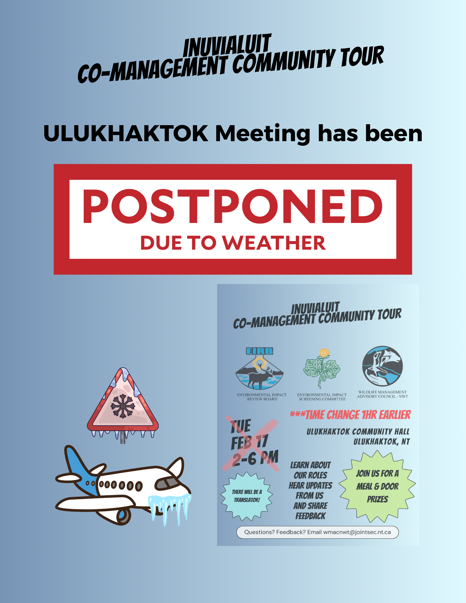 The Environmental Impact Review Board (EIRB), the Environmental Impact Screening Committee (EISC), and the Wildlife Management Advisory Council (NWT) (WMAC (NWT)) regret to inform the community of Ulukhaktok that the planned visit in February 17, 2026 was unable to proceed due to weather-related travel disruptions.